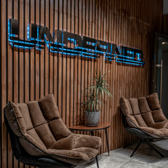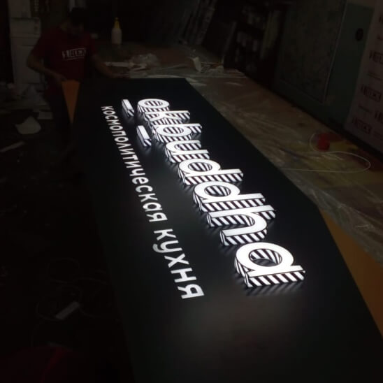 Задник объемных букв с контражуром рассеивает свет по подложке или стене. Устанавливать такую вывеску нужно на определенном расстоянии от фона, чтобы создать эффект контурной подсветки.