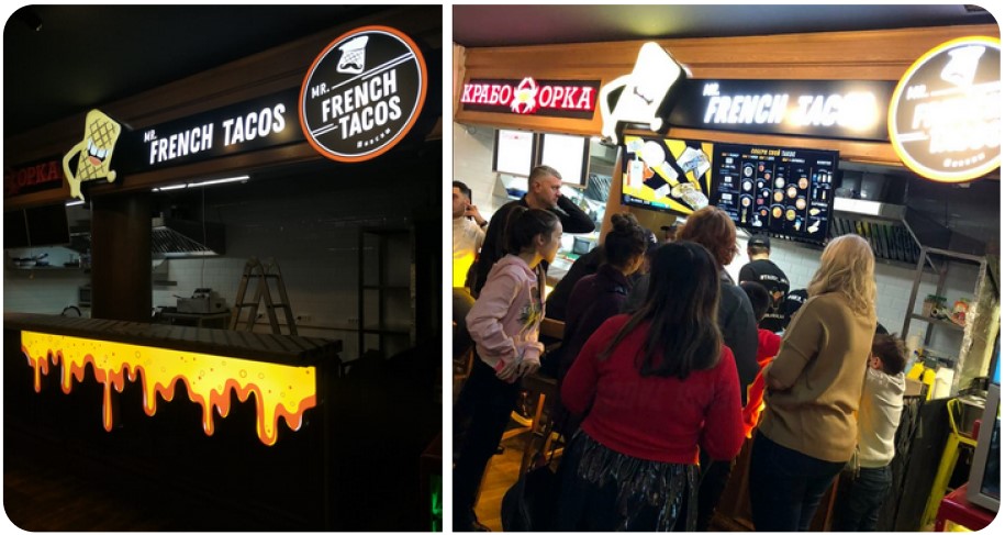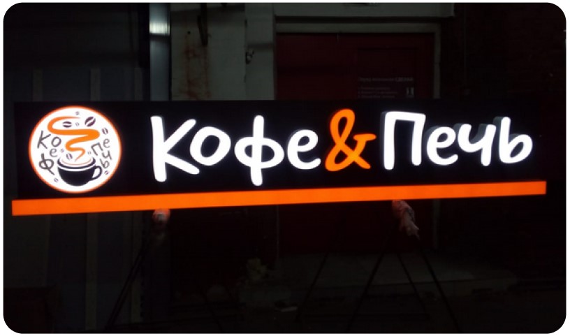 Не будем забывать, что кафе располагаются не только в отдельных помещениях но и в торговых центрах или гастро-пространствах. И там действительно побеждает тот, кто заметнее. В таких случаях мы предлагаем комплексное оформление торговой точки: вывеска, неоновая подсветка и фигуры, световые конструкции для барных стоек и прочее.