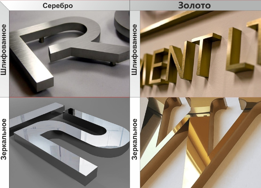 Стальную вывеску можно сделать зеркальной или с царапанной текстурой, золотую или серебряную. Хорошо смотрится сталь, окрашенная порошковой покраской и с установленной контражурной подсветкой.